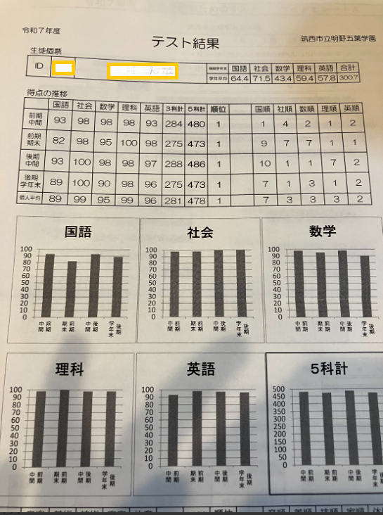 学年末テスト 明野五葉学園8年生Yさん 学年1位獲得